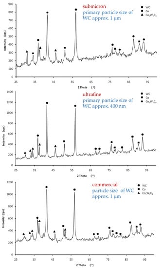 The presence of intermediate carbide Co3W9C4 in the material when cemented carbides with low cobalt contents were also observed in works [37,38]. Co3W9C4 phase is formed as a result of the reaction of W2C and Co3W3C, according to Equation (2).