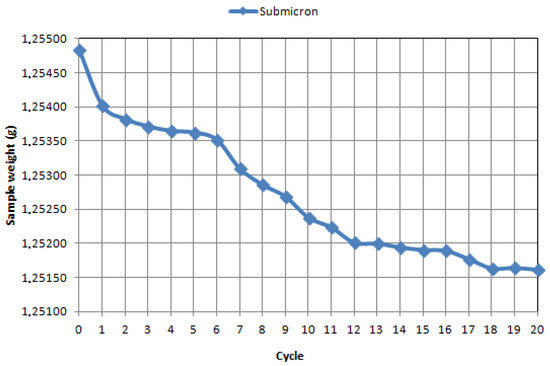 In contrast, commercial WCCo cutting inserts are characterized by stabilized wear after the 16th cycle. It should also be noted that the nature of the inclination of the curves indicates different wear characteristics of each material. For the ultrafine material, the first wear stop is already visible after cycle 2, further on in cycles 4–6, and then only in cycle 20. The submicron material is more similar in nature to the commercial material; stabilization zones are observed in similar cycles and in similar interval lengths. The material made of nano-powder stabilizes the longest, but it should be assumed on the basis of the obtained curves that the period of stable wear will be the longest for it.