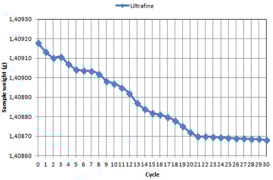 Loss of mass during tribological tests after 30 cycles for sintered WCCo made of ultrafine with 5 N load.