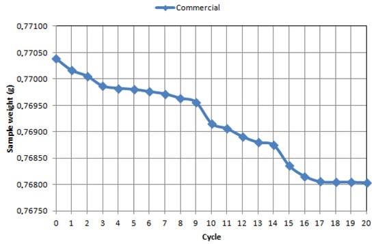 The tribological wear test consisted of twenty cycles, each lasting 10 min. After twenty cycles, the friction force was measured for each sample to determine the coefficient of friction. Each sample was cleaned with an ultrasonic cleaner before and after each cycle, then dried and weighed with an accuracy of 0.00001 g to determine the mass loss.