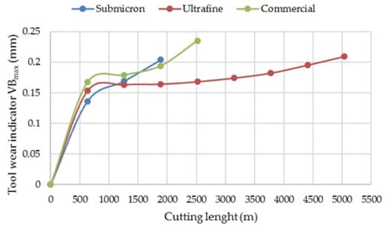 Example wear curves of the tested multi-edged knives are presented in Figure 10. The obtained curves have a course similar to the Lorentz wear curve, with the difference that after obtaining a wear criterion of 0.2 mm, the tool was withdrawn from service. However, the curves are characterized by the occurrence of two separate periods in which the wear intensity changes (the running-in period and the wear area in the steady-state). The longest courses of wear curves were determined for tools obtained from ultrafine powder, in which the size of the original particles was 400 nm. The use of ultrafine insert did not change the character of the wearing course, e.g., by eliminating the running-in phase, but it caused the normal wear time (second phase) to be extended more than twice. Based on Figure 10, it was found that the use of ultrafine carbide blades increases the service life significantly compared to submicron and commercial carbide blades. The results obtained are consistent with literature studies.