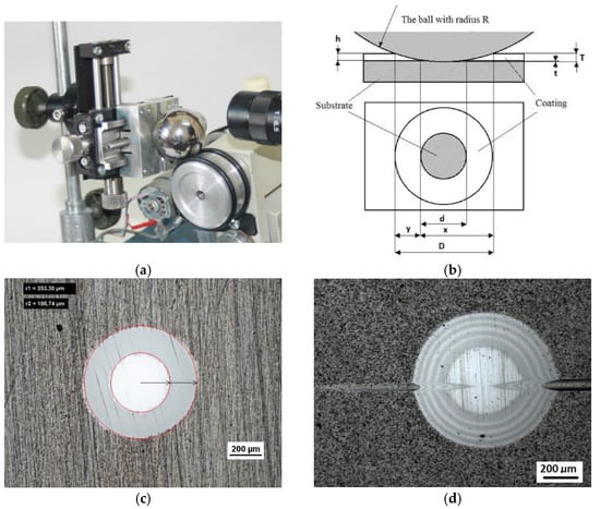 Recalo; (a)—a ball in a tribological node, (b)—a scheme of the geometry of the spherical microsection with an indication of measurement parameters for determining thickness of the coating, (c)—a image of multi-layer PVD CrN (Nikon), (d)—an image of multi-layer PVD coating spherical microsections CrN/CrCN ×4 /HS6-5-2 (Nikon). All units appearing in drawings are measurement in (µm).