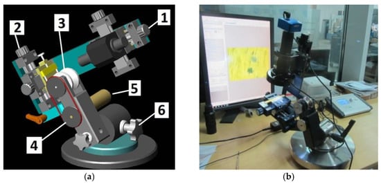 A new type of Recalo (a)—an assembly drawing structure; 1—a optical head with sight, y-x axis sample; 2—a head with micro vice; 3—a ball drive roller; 4—a belt transmission; 5—a x-y axis electric motor, rotation speed 100 ÷ 350 n/min; 6—a angular head with movement lock, (b)—a version dedicated to the Recatest research technology with precise location of the spherical microsection.