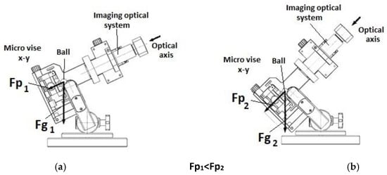 The Recalo test stand design allows a stepless adjustment of the free-rolling abrasion ball without changing the position of support points on the roll and the tested surface. The angle changes can be made during the friction process with the ball (Figure 3). It is particularly important when making precise, shallow microsections on brittle surfaces, e.g., Si specimens with PVD coatings. The stability of the image system optical axis allows controlling the process of ball indentation and exposing the deeper structures. The range is controlled by periodic removal of the ball from the roll and exposing the field of operation. After the observation, the ball is replaced in the friction nodes.