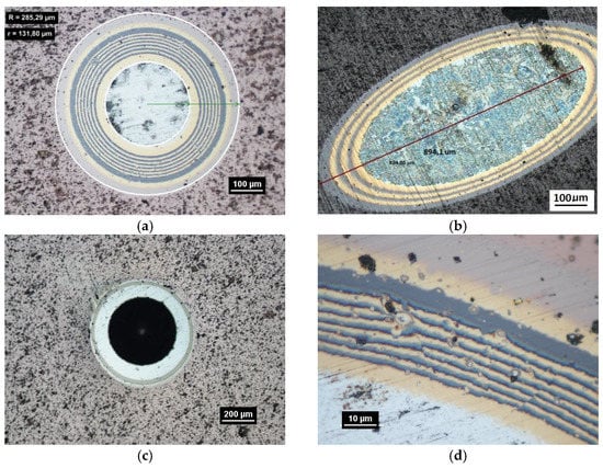 The thickness of coatings obtained with the use of galvanic methods and CVD, PA CVD (chemical vapor deposition with plasma activation), PVD, PA PVD (physical vapor deposition with plasma activation) is 0.2–30 µm. Most coating materials, such as carbides, nitrides, carbon coatings, e.g., TiN; TiCN; TiC [1,2], CrN [3], CrN/CrCN [4,5,6], AlTiN; TiAlCrN [7], ArCrN; TiAlN [8], and DLC [5,9], on tools and machine parts have a thickness within the dimensional tolerance required by the tool geometry. The thickness of such functional coatings is within the range of 0.2–5 µm. The development of material engineering of tool and machine coatings is based on the structural and phase synergism or antagonism of primary structures in order to obtain totally new operational properties, such as better hardness, lower friction coefficient, improved strength, hydrophobicity, etc. [7,10,11,12]. The improvement of coating technologies is inextricably connected with the search for investigation tools for quick evaluation of the tool quality and structural construction revealed on a metallographic microsection. One of the basic quality acceptance criteria of coatings is thickness measurement, evaluation of the metallographic structure, including the areas neighbouring the substrate–adhesion to the substrate [13,14,15].