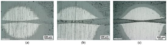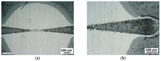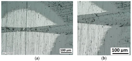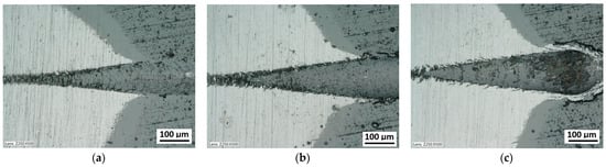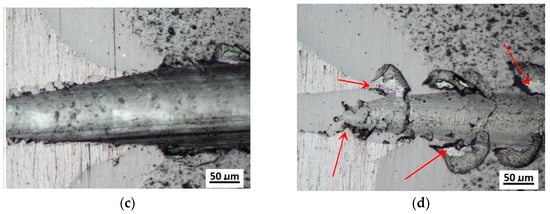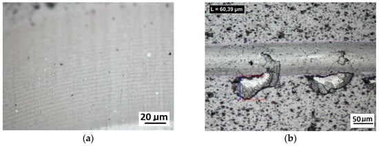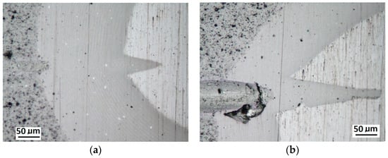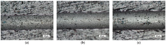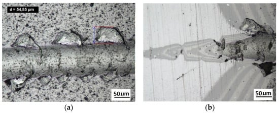 Scratch tests in the Fn = 0–150 N load range were performed on the coating surface. The scratch length was 11 mm. The visual inspection of the scratch bottom and sides (Figure 16, Figure 17 and Figure 18) allowed determining two types of damage disturbing its cohesion: Lc1 first crack (Figure 17c), Lc2 first chipping on the flash side (Figure 18a). The coating maintained cohesion with the substrate along its entire length, and no adhesion loss was observed.