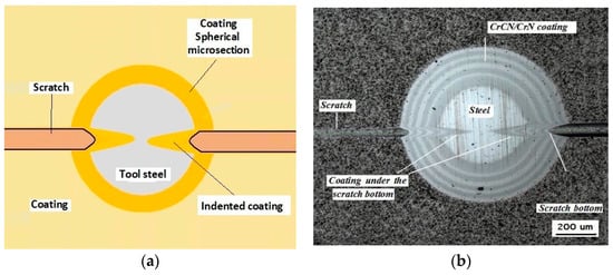 Figure 9. Diagrams and a microstructure image (spherical microsection) of the coating areological system in the scratch area: (a)—a spherical microsection diagram, (b)—microstructure of the CrN coating revealed on the spherical microsection with a description (30 mm ball).