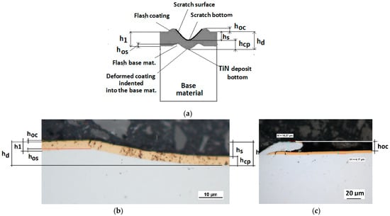 Figure 10. Diagrams and a microstructure image (perpendicular microsection ) of the coating areological system in the scratch area: (a)—a spherical microsection diagram, (b)—a microstructure of the TiN coating a perpendicular microsection diagram, letters are assigned to the measured structure: h1—coating thickness, hd—scratch depth, hoc—flash height, hd—coating indentation depth, hs—scratch bottom depth, hcp—thickness coating pressing under the scratch bottom, hos—height of the outflow of the base material, (c)—a microstructure of the TiN coating a perpendicular microsection diagram, hoc—height of the outflow of the coating material parameter.