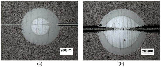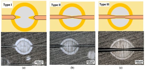 While conducting optical observations of the spherical microsection in the area of the scratch, three basic types of structural images can be defined. The differentiation results from the mutual relation of the depth of the scratch bottom and the depth of the spherical microsection (Figure 11). So, three types of structures can be defined in which the spherical microsection is: