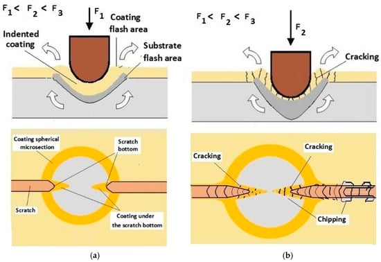 The precisely defined place and geometry of analysed microstructure areas on the spherical microsection are a source of new qualitative and quantitative data that evaluate the system mechanical durability (cracking, chipping, delamination). In industrial and laboratory practice, the normalised basic scratch test is carried out using a diamond indenter in an automatic cycle with a controlled penetrator pressure force and load speed, while recording acoustic emission.