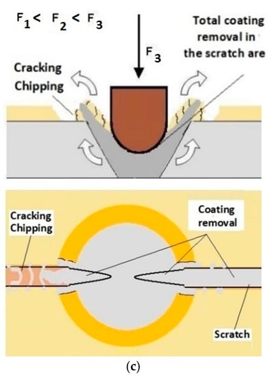 This is a figure. Schemes follow the same formatting; (a) a type A microstructure, the coating microstructure with structural continuity under the scratch bottom; (b) a type B microstructure, the coating microstructure with partial loss of structural continuity under the scratch bottom; (c) a type C microstructure, the coating microstructure with total loss of structural continuity under the scratch.