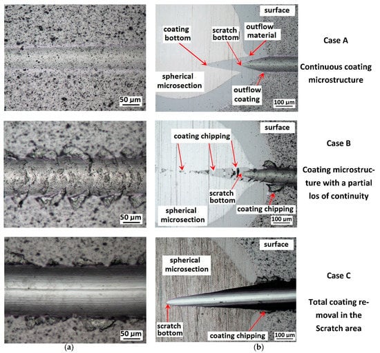 - Case C corresponds to the total coating removal from the plastic strain area when the local deformation force Fn (N) is exceeded. The microstructure observation on the spherical microsection does not indicate the presence of the coating material under the scratch bottom and on the scratch rim. The system quality is poor.