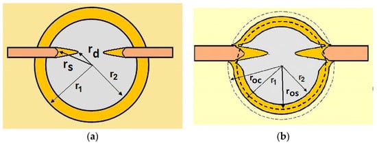 The PVD coatings and A type traces of the scratch revealed on the surface of the spherical cut on steel; (a)—a deformed coating without flashing on the edge of the crack, (b)—a deformed coating with a flash on the edge of the crack, the outflow of the coating material, the base material. Explanation of the markings; rd—radius of the depth of pressing the deposited coating, rs—radius to the apex of the scratch bottom, r1—radius of the base of de cap, r2—radius of the lower limit of coating, ros—radius of the upper edge of the outflow substrate material, roc—radius of the upper edge of the outflow coating material.
