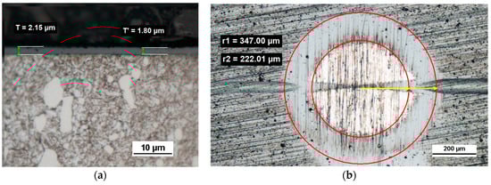 The radii specified in Figure 14 correspond to the respective distances between the centre of the spherical microsection and a given characteristic point of the coating structure, namely: rs determines the scratch bottom point, rd determines the distance to the coating end point under the scratch, roc determines the radius of the outflow coating material, ros determines the radius of the outflow base material, r1 determines the radius of the bowl boundary, and r2 indicates the radius on the coating end boundary under the surface. Based on measurement data from Figure 14 and Figure 15 and mathematical relationships between geometrical points on the spherical surface, the following values can be determined: coating thickness, scratch bottom depth, and thickness of the coating underneath the scratch bottom. The geometrical relationships and exemplary calculations conducted on the basis of data from Figure 8 and Figure 9 are shown in Table 2 below.