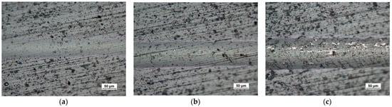 The scratch test, structure of the scratch bottom surface; (a)—a load force range for 16–27 N, (b)—a load force range for 39–50 N, (c)—a load force range for 64–78 N, Fn = 64 N (Lc1).