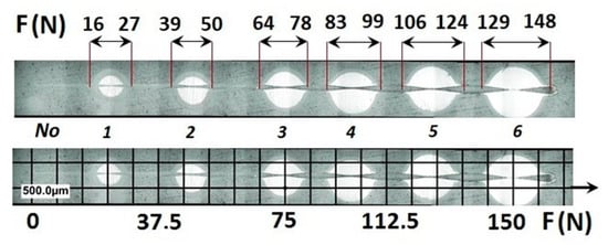 Damage of the layer-substrate system is detected and evaluated based on a direct microscopic observation of the scratch and on a measurement of acoustic emission and tangential force. The normal force at which the damage appears is referred to as a critical load (Lc). The main cases of changes and damage occurring during the scratch test can be classified as plastic deformation, cracking (Lc1), peeling (chipping) (Lc2), and penetration of the coating into the substrate in the central part of the scratch trace (Lc3). Information on the phenomena of degradation of the coating structures coming only from the scratch surface is incomplete. The cracks and edges visible on the surface of the cracks, cohesive chipping and delamination only inform about the occurrence of such phenomena in correlation with the force loading the areological system. Analysis of the image of the degraded structure on the spherical microsection surface (Figure 6 and Figure 7) allows for a precise evaluation of the mechanical degradation of the internal structures of multilayer coatings. Crack scattering phenomena at the phase boundaries of layers, separations, inclusions, areas of selective delamination, etc. become visible.