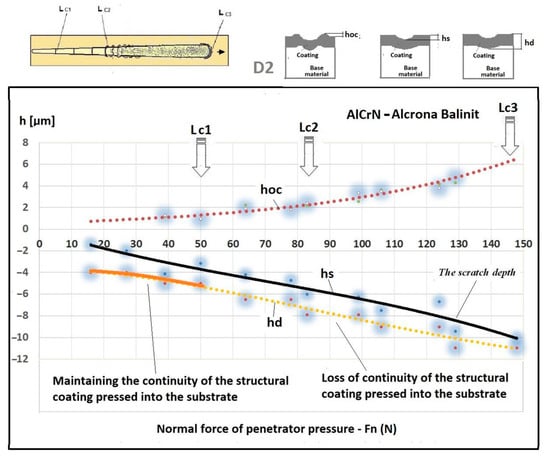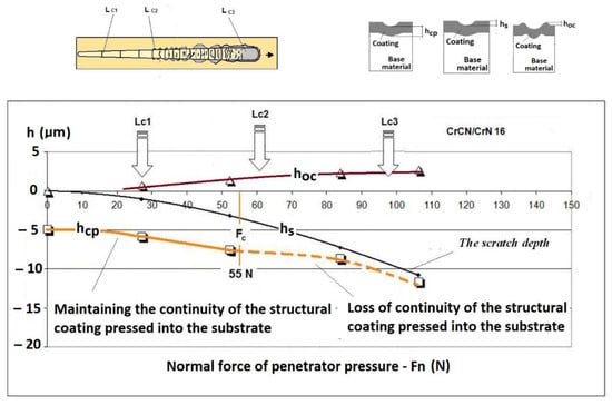 - An example of the diagram and structure of the deformed CrN, TiN coating revealed on the spherical microsection within the scratch area and identified quantitative parameters are shown in Figure 9 and Figure 10.