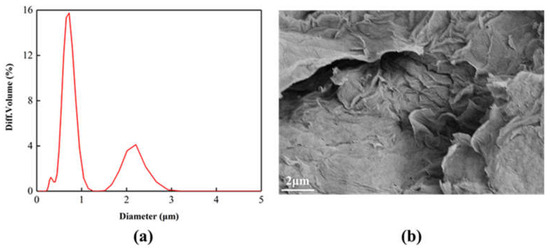 The Particle size distribution of the GO after sonication is shown in Figure 2a. The GO particle size is concentrated at 0.7 μm. Figure 2b is the SEM image of GO. It can be seen that the surface of GO is relatively smooth, showing accumulation phenomenon, and the surface is slightly wrinkled. This is because the surface of GO contains a large number of oxygen-containing functional groups. There is a strong interaction force between them, which causes the layers to pile up on each other.