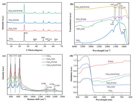 The XRD patterns of the TiO2, TiO2/GO, TiO2/PANI, and TiO2/GO/PANI nanocomposites are presented in Figure 3a Diffraction peaks are found at 2 θ values of 25.5°, 37.9°, 48°, 54.2°, 55.3°, and 62.7°, which correspond to the (101), (004), (200), (105), (211), and (204) reflections of the tetragonal TiO2 anatase phase [37]. After the introduction of GO and PANI, no new characteristic peaks appeared in the composite material, and the TiO2 reflections are unaffected. This implies that the addition of GO and PANI had no effect on the crystallization behavior of TiO2. The average grain size of the TiO2 particles in the TiO2/GO/PANI composite material was calculated to be 20 nm using the Debye–Scherrer formula.