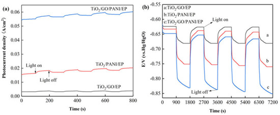 Figure 4a shows the curve of the photocurrent density as a function of irradiation time of the Q235 coated with TiO2/GO/EP, TiO2/PANI/EP and TiO2/GO/PANI/EP coating under intermittent light on and off. It can be seen from the photocurrent diagram that during 100 s illumination the photocurrent the photocurrent is relatively stable at a positive value, indicating that most of the photogenerated electrons and holes can be separated before recombination. Electrons are in situ transferred to the coupled metal and, thereby, achieve cathodic protection. All the samples showed an instantaneous photocurrent response when the light was turned on, and the photocurrent gradually disappeared after turning off the light. However, the electrolyte may diffuse into the coating [44], and thus the photocurrent density did not return to its original value after each switch off, leading to a gradual increase of the photocurrent curve. and the photocurrent response did not change, indicating that the coating has excellent stability, which is essential for long-term practical applications. In addition, it can be observed that the photocurrent density of TiO2/GO/PANI/EP is the highest, which can reach up to 0.06 A/cm2. This result may be explained by a synergetic effect of the broadening of the spectral absorption range and the improvement of the separation efficiency of photo-generated electron-holes. The extremely high electron transfer efficiency of GO on the one hand reduces the recombination efficiency of photogenerated electron-hole pairs, while on the other hand it can change the migration direction of photogenerated electrons. Furthermore, the PANI may also expand the light absorption range and promote the generation of photoelectrons and their separation from the holes.