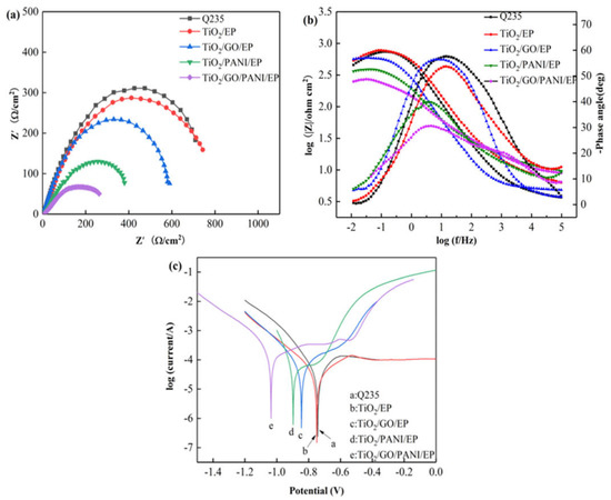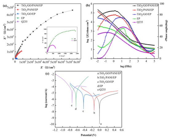 Figure 7a,b show the equivalent Nyquist and Bode diagrams as in Figure 7 for the Q235 carbon steel, TiO2, TiO2/GO/EP, TiO2/PANI/EP, and TiO2/GO/PANI/EP composite coatings in 3.5% NaCl under light illumination. The arc radius of the capacitive reactance directly reflects the electron transfer efficiency of the semiconductor under light. Generally, the smaller the capacitive reactance arc radius of the coating, the higher the conductivity of the coating, and the higher the electron migration rate of the semiconductor. It can be seen from Figure 7a that the capacitive arc radius of all coatings is reduced as compared to the pure TiO2 coating, whereby the arc radius of the TiO2/GO/PANI/EP coating is the smallest, indicating that the photogenerated electron-hole pair has the fastest transmission speed. The better the conductivity, the better cathodic protection performance. It can be seen from Figure 7b that the phase angle of the TiO2/GO/PANI/EP coating is the smallest and the |Z| value is the lowest, which again indicates that the photogenerated electrons are transmitted to the metal surface faster and the photoelectrochemical reaction activity is higher. Figure 7c shows the Tafel polarization curves of the composite coatings. It can be seen that the corrosion potential of all coatings is significantly shifted to the left compared to the Q235 carbon steel, and the corrosion current density is significantly increased. Under light illumination, the semiconductor produces a large number of photogenerated electrons, which transfer to the surface of the Q235 carbon steel substrate, and the corrosion potential is reduced. In this state the coating provides photocathode protection, where the corrosion potential of the TiO2/GO/PANI/EP coating is the lowest and the protection effect is the best.