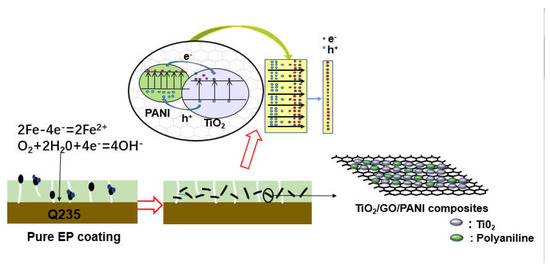 To further improve anti-corrosion performances, a composite coating protection method is proposed in the present study that combines the traditional method with the photogenerated. TiO2/GO, TiO2/PANI, and TiO2/GO/PANI composite materials were gradually synthesized by a one-step hydrothermal method and in situ oxidative polymerization. As shown as Figure 1, the GO dispersion, and nano-TiO2 transferring to a reaction kettle operated at 85 °C for 12 h of hydrothermal reaction followed. After centrifugation, drying and grinding, the TiO2/GO nanocomposite was synthesized. Then, the TiO2/GO nanocomposite was added to the aniline-containing emulsion for in situ polymerization. Finally, the TiO2/GO/PANI composite material was used as a filler with EP as the film-forming substrate to form a composite protective coating, which was directly deposited onto Q235 carbon steel plates to evaluate the photocathode protection effect and anti-corrosion performance. Results show the addition of TiO2/GO/PANI nanocomposite can greatly improve the anticorrosion performance of EP-coating. Hypothesized mechanisms for the corrosion resistance of the TiO2/GO/PANI/EP was discussed. The composites provide improved photocathodic protection under visible light illumination and physical barrier layer protection in dark condition.