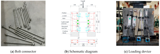 For the mechanical analysis of the TLC composite beam, the mechanical properties of the shear specimen must be determined in advance. Referring to EN 1995−1 [26], three shear specimens with the same parameters were designed for different bolt diameters. The specimens consist of one timber slab (140 mm × 360 mm × 70 mm) and two lightweight concrete slabs (140 mm × 360 mm × 70 mm). The timber slab was located in the middle of the specimen, and the lightweight concrete slabs were symmetrically arranged on both sides of the timber slab [26]. The timber slab and the lightweight concrete slabs were connected with ductile bolts. The diameters of the bolts in the shear specimen were 6 mm, 8 mm, 10 mm, 12 mm, and 16 mm, and the specimen groups were named SC6, SC8, SC10, SC12, and SC16 according to the diameters of the bolts. The bolts were embedded 50 mm in lightweight concrete. The details are shown in Figure 1.