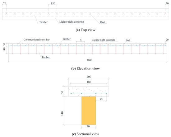 Two beam specimens with the same parameters were manufactured for one group, as shown in Table 3. Apure timber beam used as the benchmark beam, which is named group B0. The TLC composite beams were divided into five groups according to the diameter of the bolt with 6 mm, 8 mm, 10 mm, 12 mm, and 16 mm, and the corresponding names were called group BP6, group BP8, group BP10, group BP12, and group BP16. The central spacing of bolts is 150 mm. The section shape of the TLC composite beam is T−shaped, with a timber slab in the bottom part (web) and a lightweight concrete slab on the top part (flange) [15,27]. The size of the web is 70 mm × 140 mm × 3000 mm, and the size of the flange is 200 mm × 70 mm × 3000 mm. In the manufacturing process of the TLC composite beam (Figure 2), first, the anchor holes were drilled through the timber beam; then, the forms were built according to the size of the flange, and the structural reinforcements were assembled; in the third, the ductile bolts were embedded into the holes of the timber web; finally, the mixed concrete was poured to form a flange, and the TLC composite beams were completed after removing the form.