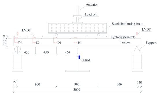 A four−point bending test was used to investigate the bending performance of the TLC composite beam. The distance between the neutral lines of the two fixed supports is 2700 mm, and the distance from one loading point to the same side support is 900 mm. The bending load of the TLC composite beam is controlled by displacement, and the loading rate is 2 mm/min. A laser displacement meter (LDM) and two LVDTs were set at the mid-span and the supports to measure the vertical displacement of the TLC composite beam [28]. To measure the relative slip of the interface between timber and lightweight concrete, four LVDTs (D1, D2, D3, and D4) were arranged, and eight strain gauges were pasted on the mid-span cross−section to measure the strain of lightweight concrete and timber. The specific layout is shown in Figure 3.