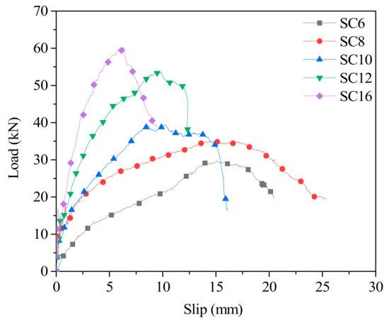 The load–slip curves of the shear specimens are shown in Figure 5. The load–slip curve can be divided into three stages. At the first stage (0–15% ultimate load), the curves are generally linear with increasing load. In this process, the bolt and the timber are well bonded, the lightweight concrete provides effective shear transfer for the bolts, and the slip curve develops slowly and steadily. In the second stage (15–100% ultimate load), the increase rate of the interface slip is obviously accelerating, and the load–slip relationship is nonlinear because the lightweight concrete is gradually cracked and the bending deformation of the bolt obviously occurs as the shear load increases. At the third stage (after ultimate loading), this process is mainly shown as the load decrease and the slip increased sharply until the shear specimen fails. It can be seen from the load–slip curve (Figure 5) that when the bolt diameter increases from 6 mm to 16 mm, the bearing load of the shear specimens increases from 27.54 kN (SC6) to 60.23 kN (SC16), and the corresponding slip at the maximum load shows a trend of gradual decrease from 15.0 mm to 6.2 mm. The bearing capacity increases significantly, and the slip decreases as the diameter of the bolt increases for the shear specimens, indicating that the bond properties between timber and concrete are good. It should be noted that the slip before the peak is highly significant, and the load–slip response of the ductile connector shows a good bearing capacity and ductility.