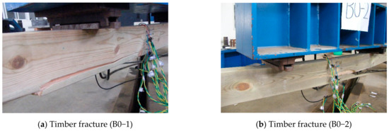 The B0 group is the control beam made of pure timber, and its size is the same as the timber part in the TLC composite beam. For the control beam, failure occurred from rupturing at the bottom in the mid-span region, and the timber ruptured in the tension zone (Figure 6). The bending deformation is obvious at the failure. The typical failure modes of the TLC composite beams are shown in Figure 7. For the TLC composite beams, the lightweight concrete flange and the timber web can work together before finally failing. The failure of the TLC composite beam is manifested as timber fracture in the tensile zone at the bottom of the web, and the lightweight concrete part in the whole loading process is basically intact. The global bending deformation of the TLC composite beam corresponding to the final failure is significant, showing good deformation capacity and satisfactory ductility of the structure. Taking BP6 group test beams as an example, the mid-span deflection corresponding to the maximum load is 69 mm (approximately L/45, L is the span).