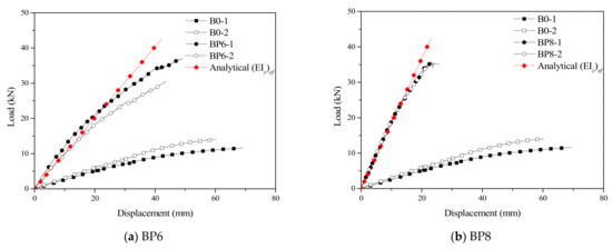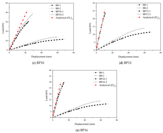 The bending test results of the control beams (B0) and the TLC composite beams (BP6–BP16) are shown in Table 5. The mid-span displacement of the test beams at a 10 kN load is listed in the table. The average mid-span displacement of the control beams is 41.8 mm and that of the TLC composite beams is between 7.8 mm and 16.6 mm. Compared with the control beam, the rigidity of the TLC composite beam increases 2.51–7.38 times. According to Euro code 5 [19], when a timber beam is used as a floor beam or slab, the displacement limit corresponding to the serviceability limit state is specified as L/300 (L is the span). The results showed that under the L/300 mid span displacement, the load PL/300 corresponding to the service limit state of the composite beam is 2.61–6.12 times higher than that of the timber beam. In addition, the PL/300/Pmax values of the timber beam and composite beam were 0.18 and 0.21–0.34, respectively, which showed that the composite beam had a high efficiency of bearing capacity utilization [29]. The combination efficiency coefficient E can be used to describe the combination degree of the combination structure. E = 1 indicates a complete combination, and E=0 indicates a noncombination structure. A larger value of E (Formula (3)) corresponds to a higher combination degree of the structure with a greater stiffness and bearing capacity.