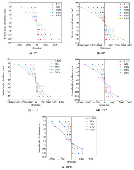 The strain change trend on the middle span section of the TLC composite beam (Figure 9) was approximately similar [30]. When the load is less than 15% of the maximum load, the strains are linear. As the load increases (15% to 100% maximum load period), the strain gradually exhibits a nonlinear trend; therefore, the interface slips of the TLC composite beam are nonlinear. Meanwhile, as the bolt diameter increases, the strains of the BP6 group to the BP16 group gradually decrease. Among them, the compressive strain of lightweight concrete for the flange plate decreases from 4000 με to 2200 με, and the tensile strain of timber for the web plate decreases from 4900 με to 1180 με. When the bolt diameter is the smallest (BP6), in the lightweight concrete section of the TLC composite beam, the strain is in the state of full compression [30]. Under the same load, the compressive strain of the TLC composite beam flange decreases gradually with increasing bolt diameter, and the maximum compressive strain range is from 3750 με to 2200 με. At the whole stage of loading, part of the flange (lightweight concrete) is in a complete compression state; part of the web (timber), with increasing bolt diameter, the neutral axis of the TLC composite beam moves toward the lower edge of the web, and the strains of the upper edge of the web change to compression [31]. In this state, the maximum tensile strain of timber in the web of the TLC composite beam is close to the maximum tensile strain of timber measured by the tension test, which indicates that the strength of timber has been fully utilized. The maximum compressive strain value of the lightweight concrete of the TLC composite beam is generally less than 2000 με, while the main failure of the TLC composite beam is the fracture of timber in the web. Therefore, it is difficult to give full play to the strength of lightweight concrete. During the whole loading process, the strain curve of the TLC composite beam section is smooth, and the strain distribution has no distortion, which reflects the good deformation coordination between timber and lightweight concrete.