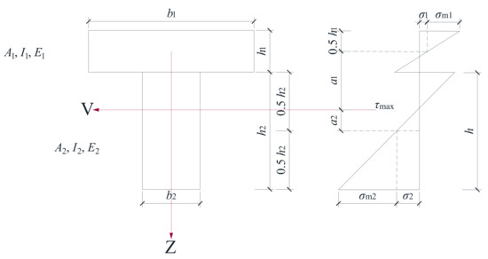 In Formulas (5) and (6): E1 is the elastic modulus of lightweight concrete, N/mm2; E2 is the elastic modulus of timber, N/mm2; nc is the section conversion coefficient between lightweight concrete and timber, nc = E1/E2; A1 is the section area of lightweight concrete, mm2; A2 is the section area of timber, mm2; h1 is the height of the lightweight concrete flange, mm; h2 is the height of the timber web, mm; a1 is the distance from the center of the lightweight concrete to the neutral axis, mm; a2 is the distance from the center of the timber web to the neutral axis, mm; b1 is the width of the lightweight concrete flange; and b2 is the width of the timber web, mm.