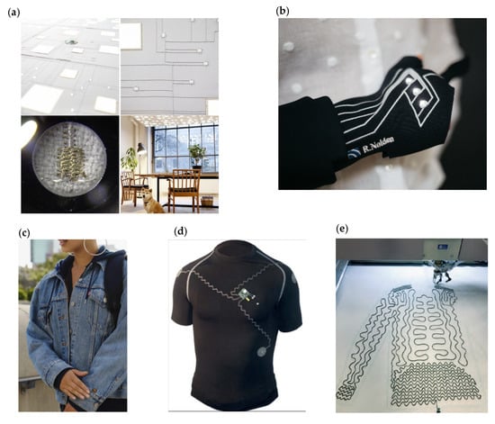 (a) Embroidered light for acoustic ceilings [6] (b) Smart glove [8] (c) Jacquard Trucker Jacket Levi’s® [4] (d) EKG shirt with embroidered electrical interconnections [7] (e) Embroidered heating jacket [11].