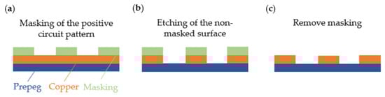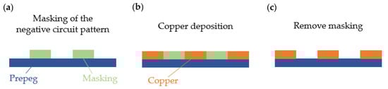 In contrast to the subtractive method, the additive technology does not require the copper to be applied over the entire surface but only where it is needed as a conductive connection [15]. Therefore, the additive method is more sustainable and resource-efficient. By printing a negative conductor pattern using screen printing or photo printing, the areas that should not be electrically conductive are masked (Figure 3).