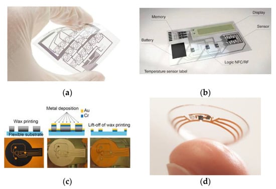 (a) Printed flexible circuit board [22] (b) Printed temperature sensor using inkjet printer [21] (c) Subtractive printing [23] (d) Intelligent contact lens using inkjet printing [25].