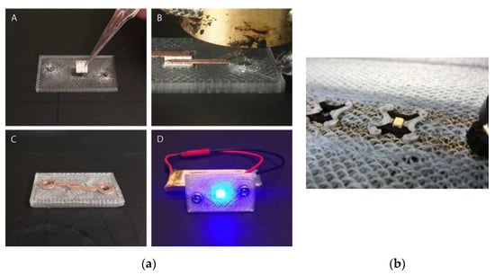 (a) Dual 3D printed circuit board (A) Inserting a LED component (B) Printing conductive traces (C) Embedded LED (D) Attached battery [30] (b) Dual 3D printing on textile fabric [29].