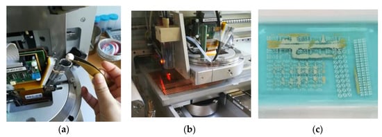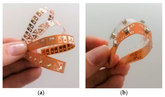 Quad Industries [22] is already presenting first approaches to printed textile and flexible printed circuit boards and sensors. They currently offer two types of technology: printed sensors and flexible heating. The special printing technology from Quad Industries (St. Niklaas, Belgium) enables the sensors printing on wafer-thin, flexible and elastic foils or directly on textiles. Qui [23] demonstrates in his research work the printing of the negative conductor pattern with wax on a pre-treated Kapton® film (polyimide film) with subsequent metallization of the conductor structures using sputtering. Thereby, a first sputtered layer of the conductor structure is based on chrome in order to ensure a fixation between the Kapton® film (DuPontTM, Neu-Isenburg/Wilmington, NC, USA) and the subsequent silver layer to be sputtered. After sputtering, the wax layer is washed off with boiling water. The corresponding electrical components are applied with a silver-containing adhesive and insulated with a polydimethylsiloxane layer (PDMS). Cui [21] describes the printing of flexible circuit boards using an inkjet printer. A circuit board with integrated temperature sensors, printed battery patches and an electrochromic display for the formation of flexible sensor tags is demonstrated. The conductor structures are printed on a polyimide film with a silver-based and a carbon-based ink. A new method of developing flexible electronics is hybrid printing, presented by Valentine et al. [24]. Conductive and dielectric elastomeric materials are printed using an ink printer and are combined with the automated assembly of surface-mounted electronic components within a single integrated additive manufacturing platform. In this process, the insulating matrix is either printed with sensory conductor structures or equipped with electronic components with subsequent printing of the electrical connections (Figure 4).