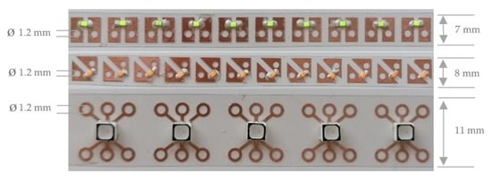 Finally, the printed sequins are cut to sequin ribbons suitable for the automated embroidery process and are equipped with the surface mounted devices. Figure 8 shows the printed single-layer LED and RGB sequin tapes on PET film with copper adhesive tape equipped with the electronic components.