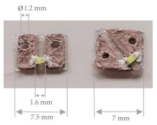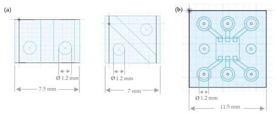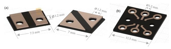 Before the flexible and functional sequins are printed with conventional and conductive filaments based on the third concept, the designs are tested with the conventional 3D printing materials PLA and ABS with the print heads AA 0.4 and AA 0.6 from Ultimaker 3. This printing test is necessary to compare and print the sequin structures with the different print heads. The designs of the one-sided sequin for LEDs and the one-sided sequin for the SMD-RGB component are created in the Autodesk® Fusion 360TM software (Version 2.0.10032) (Figure 14) with the two material combinations of the PLA filament for the carrier board and the ABS filament for the conductor structures in a 3D shape by extrusion modeling.