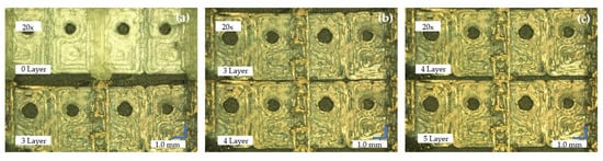 The 3D printing of a negative model in the form of a sequin made of PLA filament and masking using water-soluble PVA filament is combined with the sputtering technique for metallizing the required conductor structures in the second concept. Five plating processes are carried out to deposit five layers of gold on the sequin belt. Figure 13 shows the 3D printed sequin tape (a) with PVA reservation at the top left and the sequin ribbon with three coated gold layers at the bottom. The comparison between (b) three gold layers at the top and four gold layers at the bottom is shown in the middle. The right micrograph shows (c) four layers of gold particles on the top and five on the bottom.