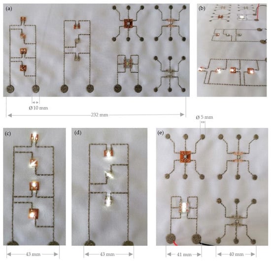 Embroidered circuit layouts: (a) Circuits for LED and RGB sequins without power source (b) overview of all Sequins with power source (c) LED sequins according to the subtractive technique (d) 3D printed LED sequins (e) RGB sequins by subtractive and additive technique.