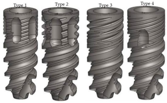 The four types of NeO ® implants inserted: Type 1—implant with 6 coronal flutes and 8 shallow microthreads. Type 2—implant with 6 coronal flutes and 4 deep microthreads. Type 3—implant with 0 coronal flutes and 4 deep microthreads. Type 4—implant with 2 shorter coronal flutes and 8 shallow microthreads.
