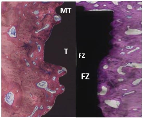 Typical micrographs of the coronal aspect of implants after 1 m and 3 m, revealing new bone close to the implant profile along with blood vessels with no signs of inflammation. MT, microthread; T, thread; FZ, flute zone.