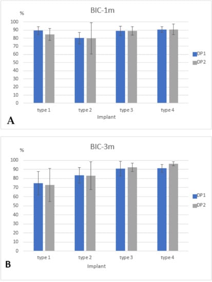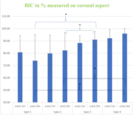 Coronal aspect bone-to-implant contact (BIC) after one month (1 m) and 3 months (3 m) for the four implant types. Data are presented as the average ± sd. * denotes p < 0.05.