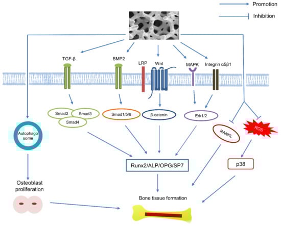 Though lacking intrinsic antibacterial properties [16], Ta has a lower bacterial adhesion level and colonization compared to titanium (Ti) and stainless steel due to the spontaneously formed oxide surface layer (Ta2O5) [17,18]. The Ta2O5 layer also has been proven to facilitate the deposition of bone-like apatite coating in simulated body fluid (SBF) [19], and further accelerate the adherence of osseous and soft tissues [20]. Moreover, nanoparticles released from Ta implants have been certified to stimulate the proliferation of osteoblasts via autophagy, and the osteogenic process can further be enhanced by autophagy inducer [21]. Although the osteogenic signaling pathways of Ta have yet been fully explicated, several studies have focused on the TGF-β/Smad3 [22], BMP2/Smad1 [23], Wnt/β-catenin [22,24], Integrin α5β1/ERK1/2 [25,26] and MAPK/ERK pathways [27] that may be involved in the osteogenic effects of Ta. It is also reported that Ta can enhance the osteogenesis of diabetic rabbits by suppressing the activation of ROS-mediated P38 MAPK signaling pathway [28]. Furthermore, Ta upregulates the expression level of osteoprotegrin (OPG) and reduces that of RANKL, which means Ta also can inhibit the activity of osteoclasts [23]. The relative molecular mechanism for the osteogenic effects of Ta has been illustrated in Figure 1.
