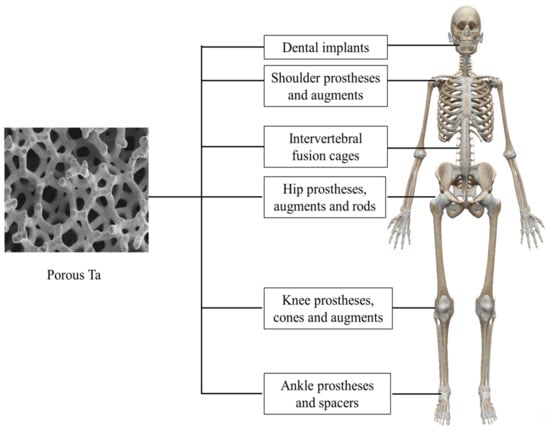 So far, porous Ta-based implants or prostheses have been extensively applied in orthopedics and dentistry (Figure 3, and typical products are shown in Figure 4). Therefore, the aim of this research is to review the clinical application of porous Ta-based implants or prostheses which have been implemented in orthopedics and dentistry, and summarize new manufacturing and modification methods for this promising porous biomaterial.