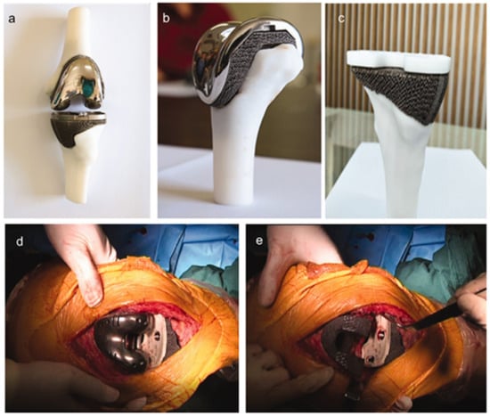 The printed personalized porous Ta knee prosthesis (a), distal femoral component (b) and proximal tibial component (c). The porous Ta prosthesis was inserted into distal femur and proximal tibia, respectively, during the surgery (d,e). Reprinted from ref. [188].