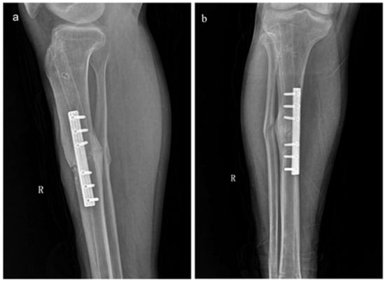 - Van Houwelingen, A.P.; McKee, M.D. Treatment of osteopenic humeral shaft nonunion with compression plating, humeral cortical allograft struts, and bone grafting. J. Orthop. Trauma 2005, 19, 36–42. [Google Scholar] [CrossRef]